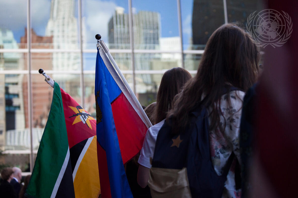 Students carrying Members States’ flags during the annual Peace Bell Ceremony held at UN headquarters in observance of the International Day of Peace (21 September).