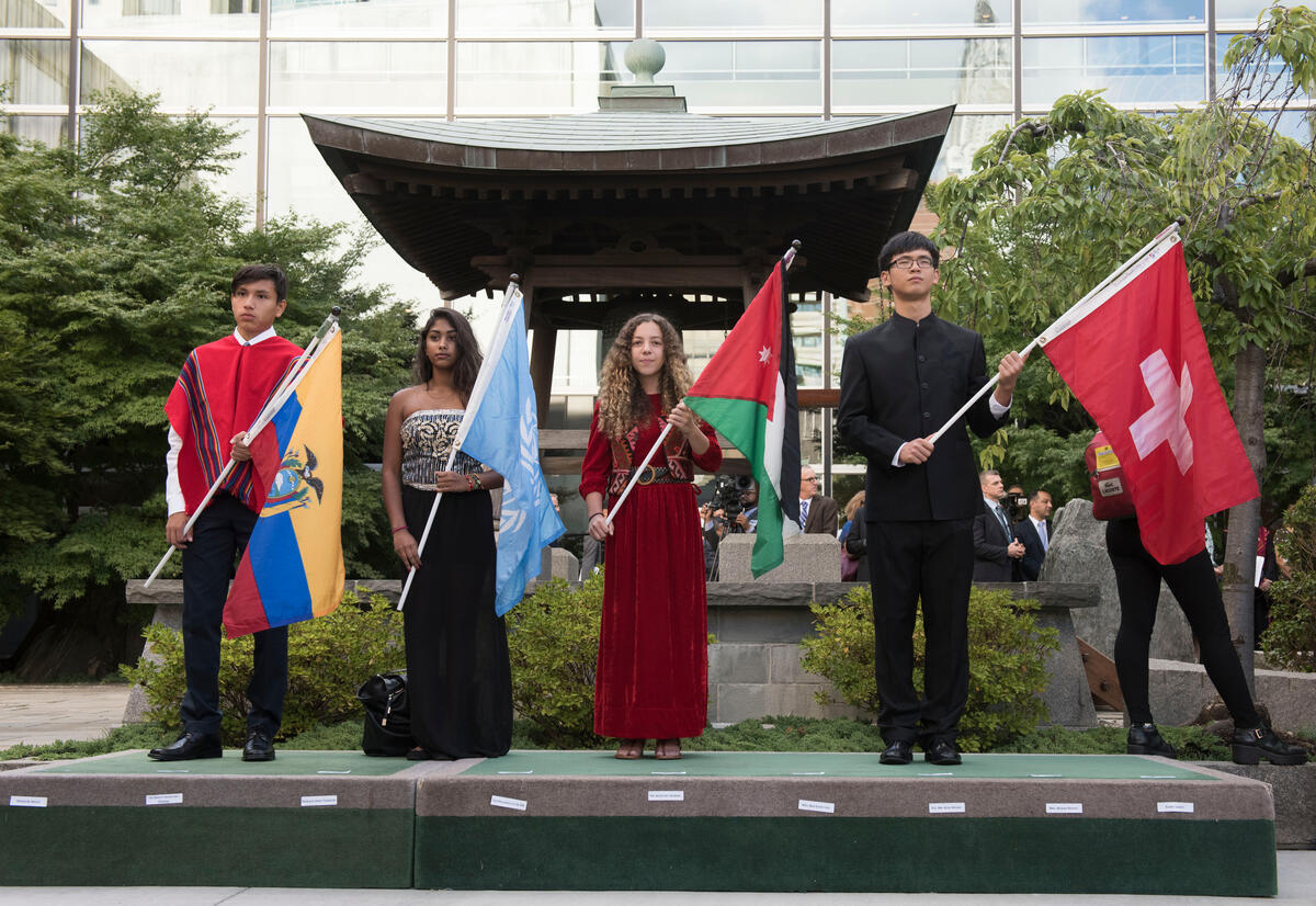 Students carrying Members States’ flags during the annual Peace Bell Ceremony held at UN headquarters in observance of the International Day of Peace (21 September).