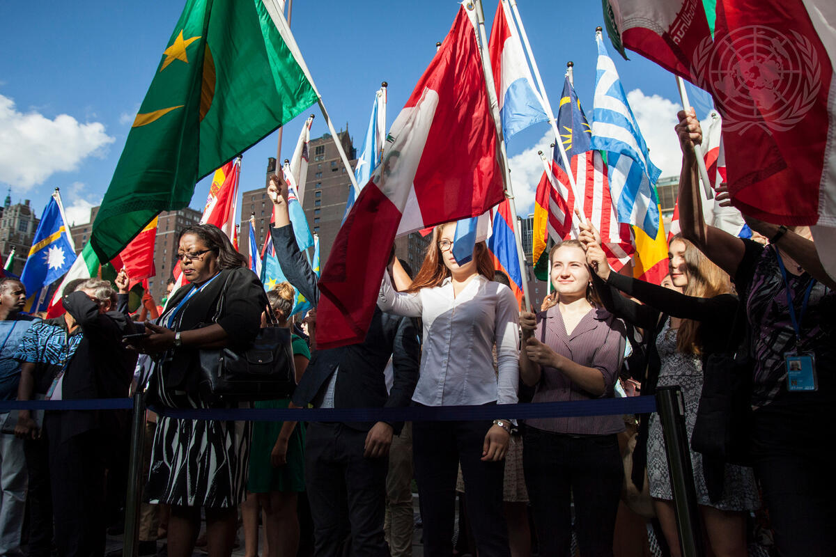 Students carrying Members States’ flags during the annual Peace Bell Ceremony held at UN headquarters in observance of the International Day of Peace (21 September).