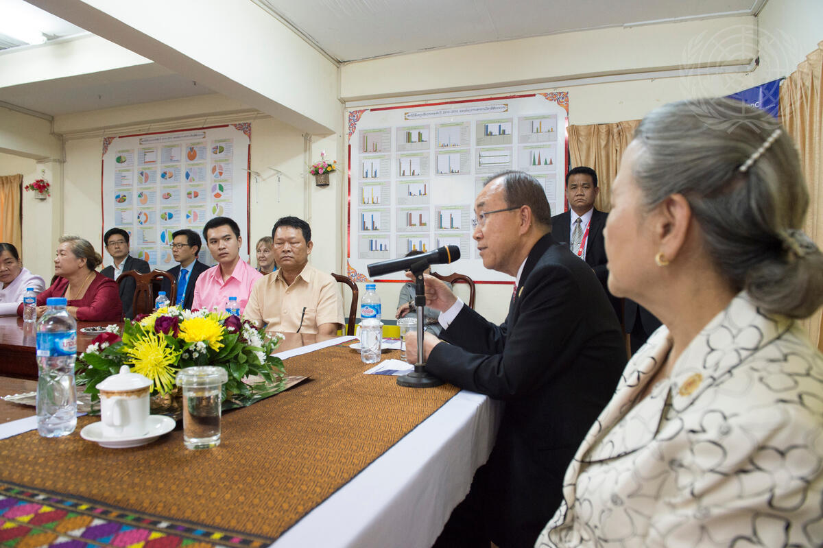 Secretary-General Ban Ki-moon (mic) and his wife, Yoo Soon-taek (right), visit Sisathanak District Hospital in Vientiane, Lao People’s Democratic Republic.
