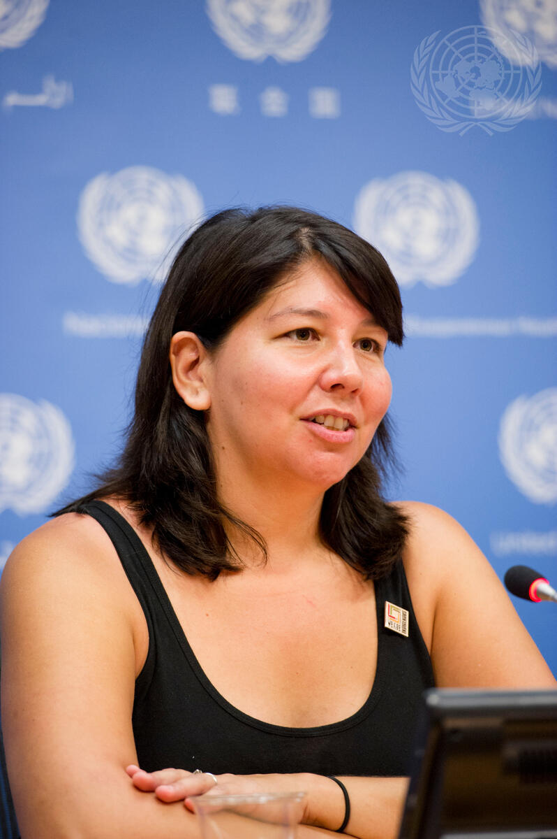 Reaghan Tarbell, documentary filmmaker and director, addresses a press Conference on celebrating the 9th anniversary of the UN Declaration of the Rights of Indigenous Peoples.