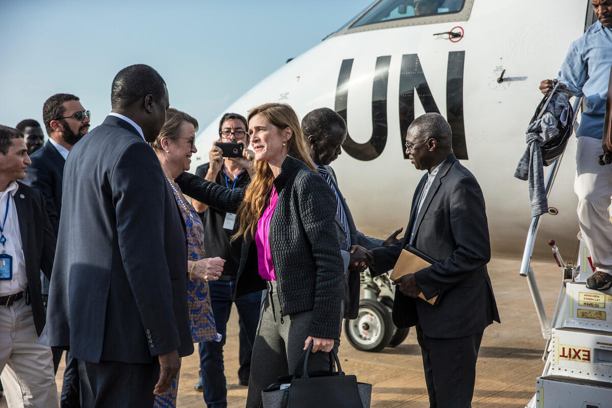 Samantha Power (centre right), United States Permanent Representative to the UN and co-lead of the Council delegation, greets Ellen Margrethe Løj, Special Representative of the Secretary-General and Head of UNMISS, upon the delegation’s arrival in Juba. Also pictured: Fodé Seck (second from right), Permanent Representative of the Republic of Senegal to the UN and co-lead of the Council delegation.