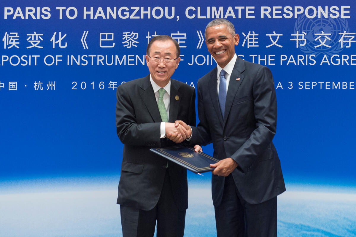 Secretary-General Ban Ki-moon (left) receives the legal instruments for joining the Paris Agreement from Barack Obama, President of the United States, at a special ceremony held in Hangzhou, China.