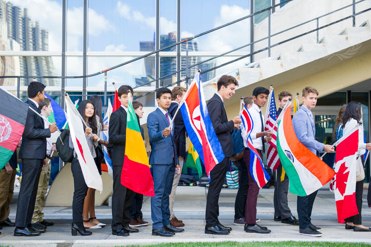 Students carrying Members States’ flags during the annual Peace Bell Ceremony held at UN headquarters in observance of the International Day of Peace (21 September).
