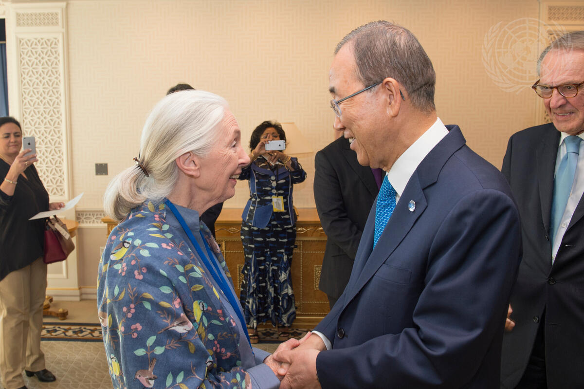 The Secretary-General Ban Ki-moon greets Jane Goodall, UN Messenger of Peace, before the annual Peace Bell Ceremony at UN headquarters imarking the International Day of Peace (21 September).