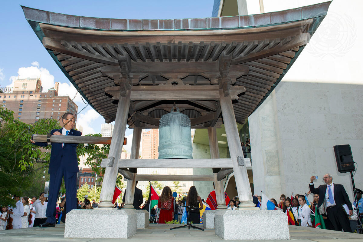 Secretary-General Ban Ki-moon rings the Peace Bell at the annual ceremony held at UN headquarters in observance of the International Day of Peace (21 September).