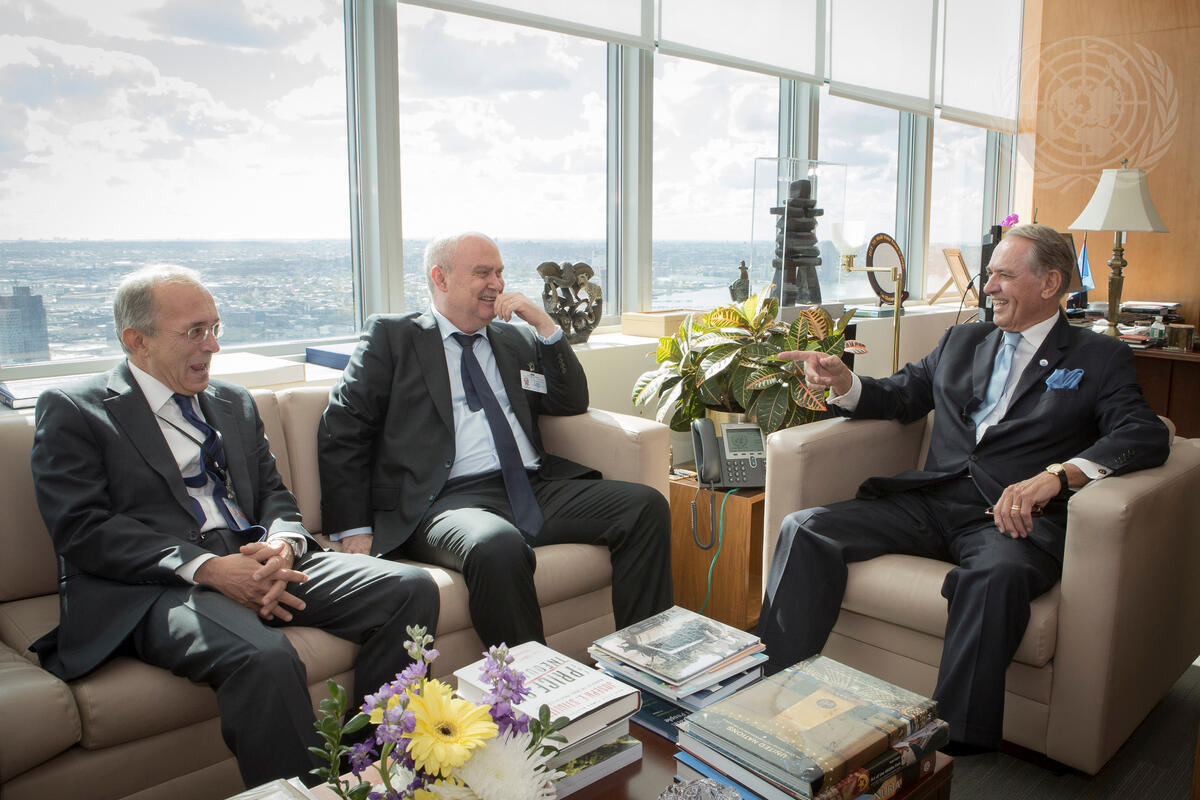 Deputy Secretary-General Jan Eliasson (right) meets with Feridun Sinirlioglu (centre), Under Secretary of the Ministry of Foreign Affairs of Turkey. Also pictured, Yasar Halit Çevik, Permanent Representative of Turkey to the UN.