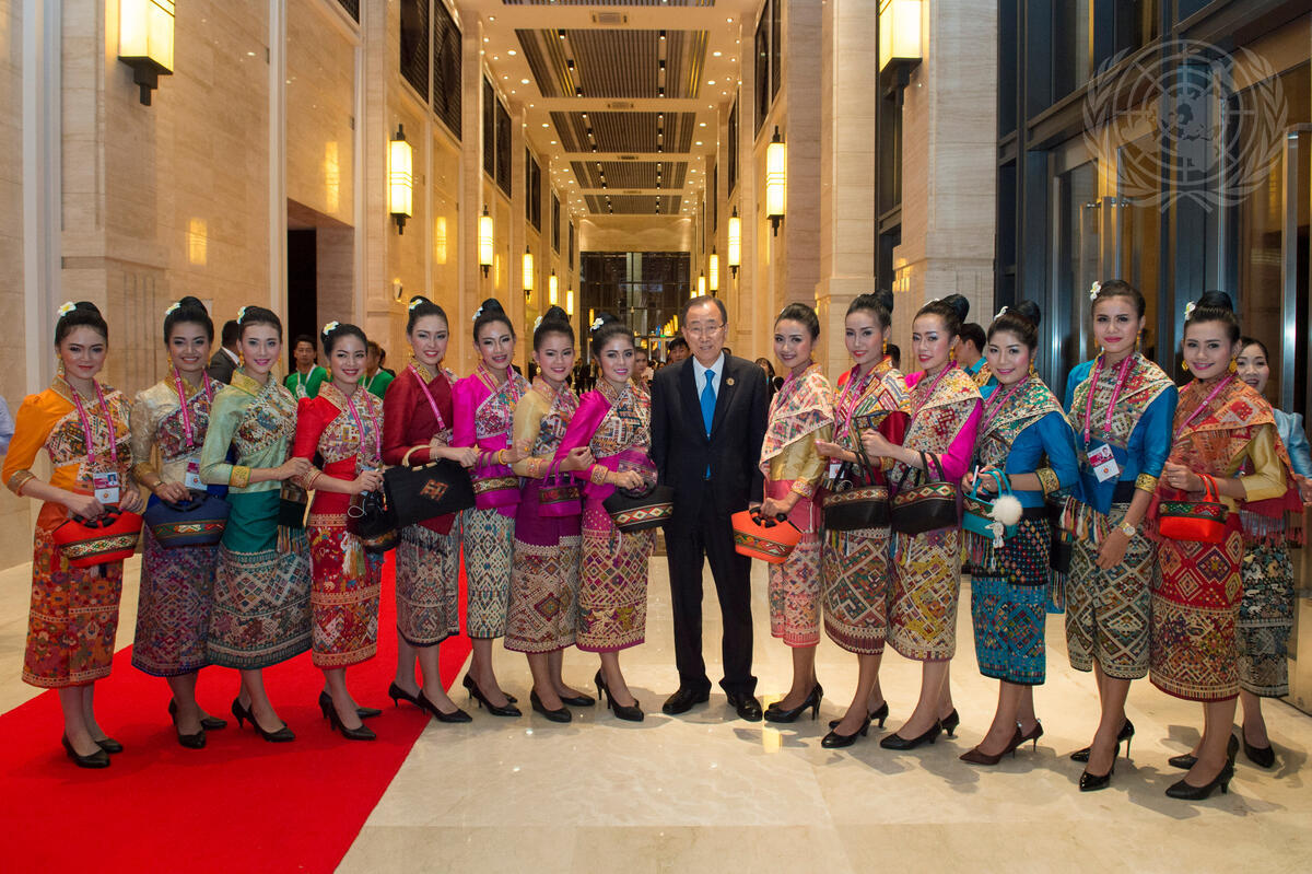 Secretary-General Ban Ki-moon poses for a group photo with conference staff at the eighth summit between the Association of Southeast Asian Nations and the United Nations (ASEAN-UN Summit), in Vientiane, Lao People’s Democratic Republic.