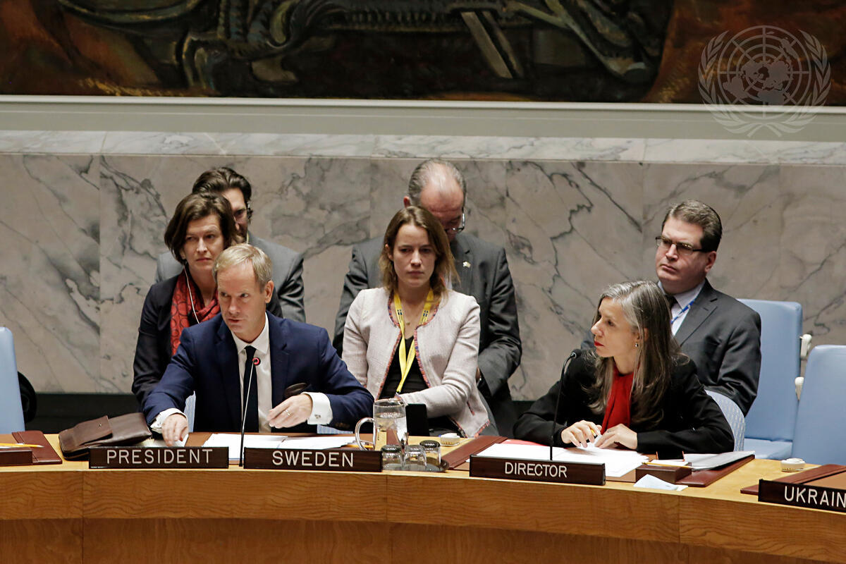 Olof Skoog (front left), Permanent Representative of Sweden to the UN and President of the Security Council for January, during the Council’s meeting on peace consolidation in West Africa.