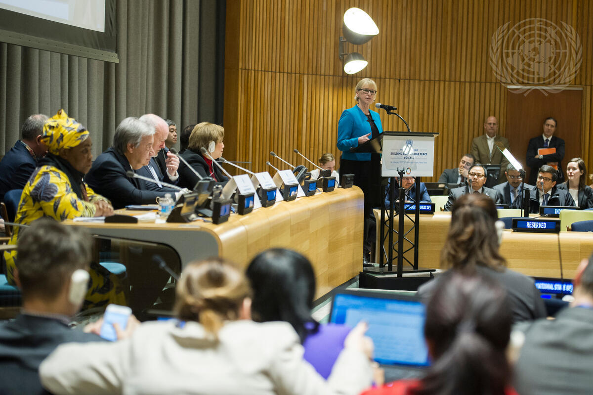 Margot Wallström (at lectern), Minister for Foreign Affairs of Sweden and President of the Security Council for January, addresses the General Assembly high-level dialogue on “Building Sustainable Peace for All: Synergies between the 2030 Agenda for Sustainable Development and the Sustaining Peace Agenda”.