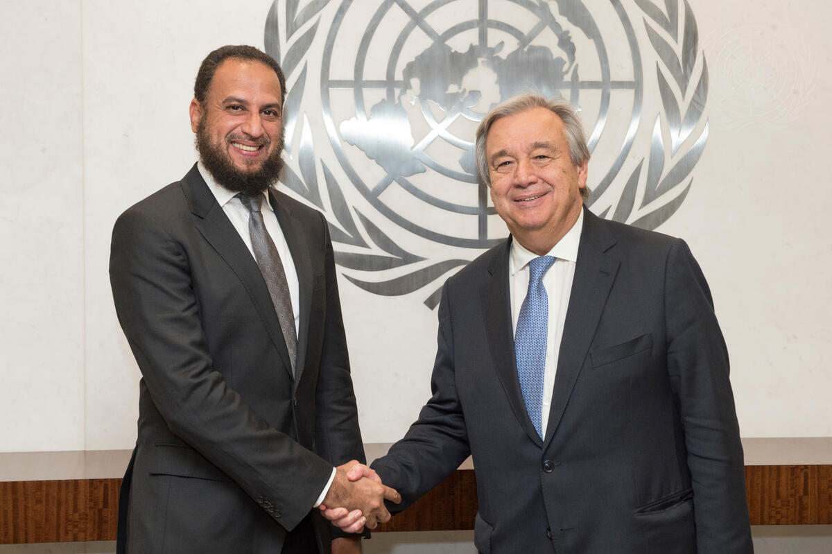 Secretary-General António Guterres (right) meets with Ahmed Al Meraikhi the Secretary-General’s Humanitarian Envoy.