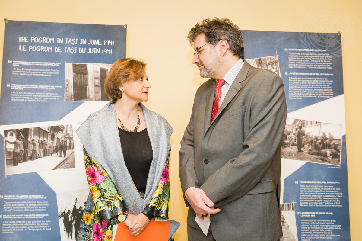 Cristina Gallach (left), Under-Secretary-General for Communications and Public Information, with Tad Stahnke, Director of the Initiative on Holocaust Denial and anti-Semitism at the United States Holocaust Memorial Museum, during the opening of a photo exhibit entitled “Education and Memory: The Holocaust in Romania”. The event was hosted by the Permanent Mission of Romania to the UN, and the exhibition was produced by the National Institute for Romanian Holocaust Studies ""Elie Wiesel"".