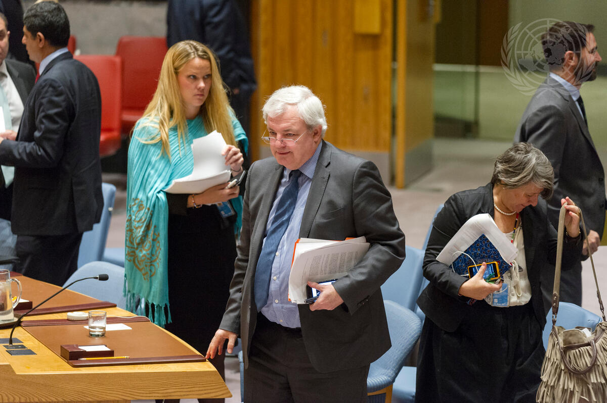 Stephen O'Brien (centre), Under-Secretary-General for Humanitarian Affairs and Emergency Relief Coordinator, arrives in the Security Council Chamber to brief the Council on the humanitarian situation in Syria.