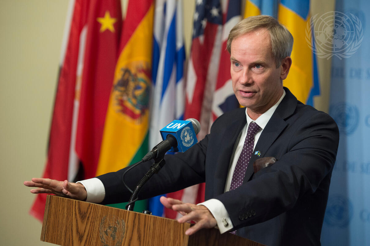 Olof Skoog, Permanent Representative of Sweden to the UN and President of the Security Council for January, speaks to journalists following Council consultations on the situation in Yemen.