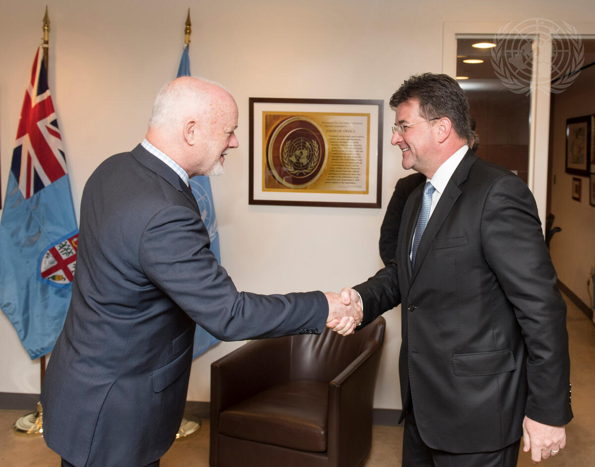 Peter Thomson (left), President of the General Assembly's seventy-first session, meets with Miroslav Lajcák, Minister for Foreign Affairs of the Slovak Republic.