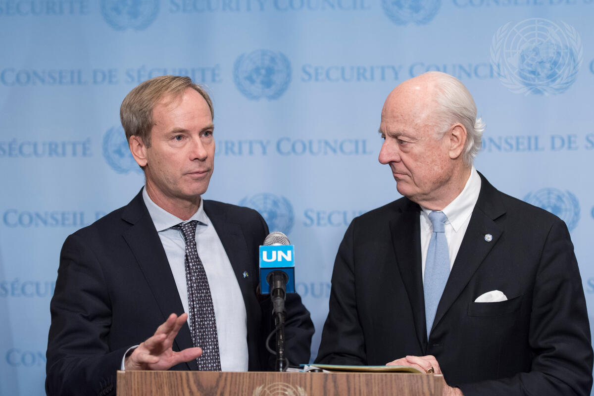 Olof Skoog (left), Permanent Representative of Sweden to the UN and President of the Security Council for January, joined by Staffan de Mistura, UN Special Envoy for Syria, briefs journalists on the situation in Syria.