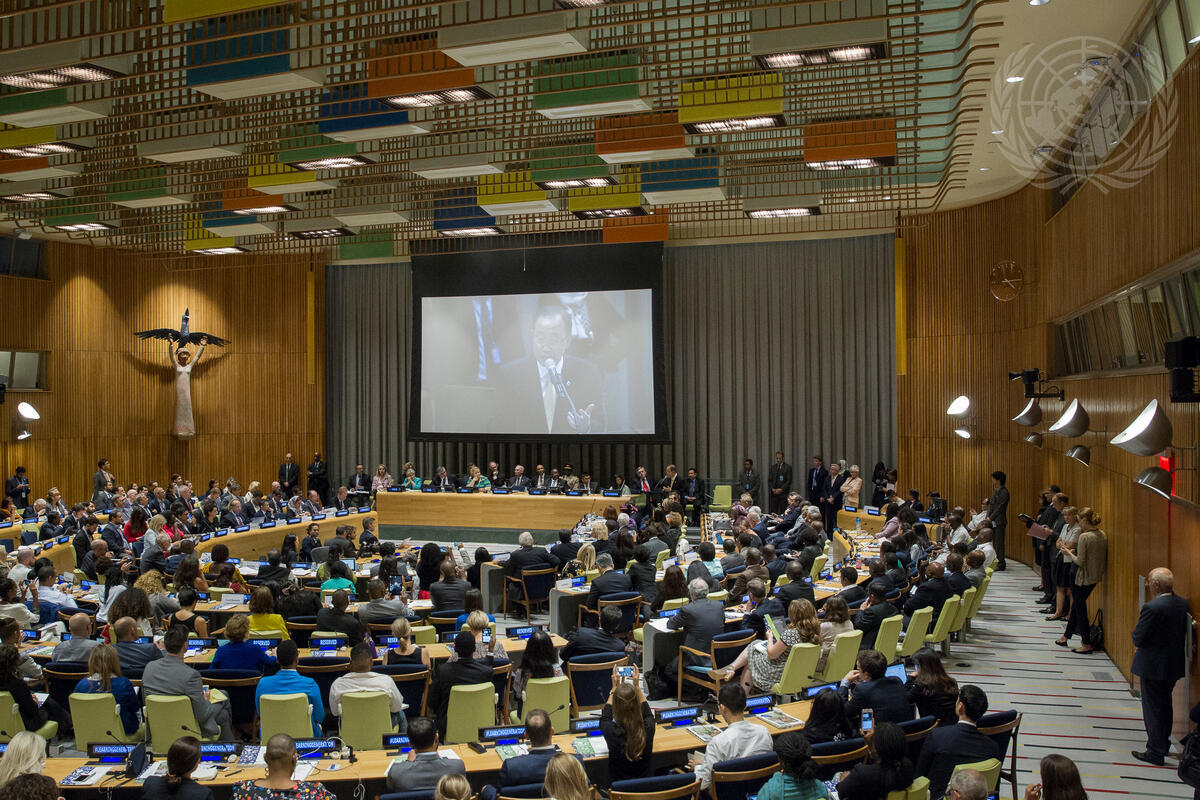 A wide view of the Trusteeship Council Chamber, as Secretary-General Ban Ki-moon (shown on screen) speaks during during a special event for the launch and handover of the report by the International Commission on Financing Global Education Opportunity.