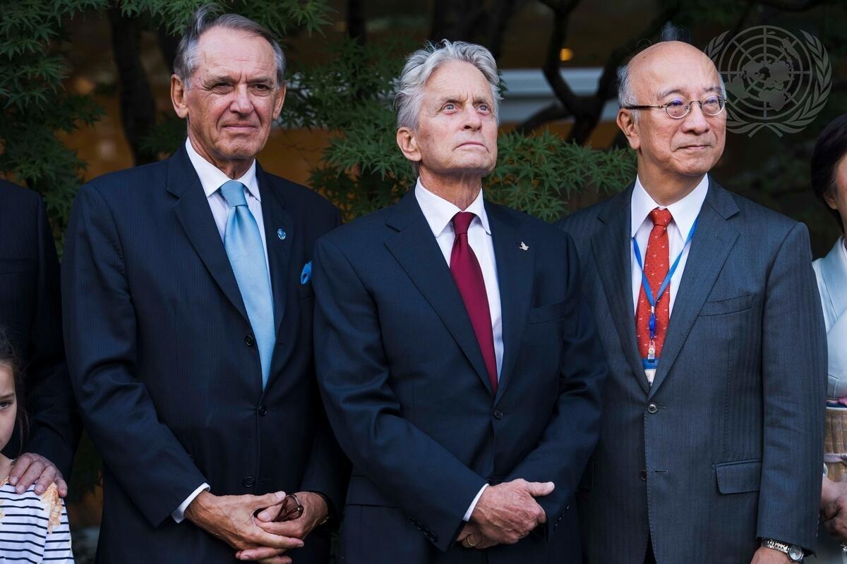 Deputy Secretary-General Jan Eliasson (left) with Michael Douglas (centre), United Nations Messenger for Peace; and Koro Bessho, Permanent Representative of Japan to the United Nations, at the annual Peace Bell Ceremony held in observance of the International Day of Peace (21 September).