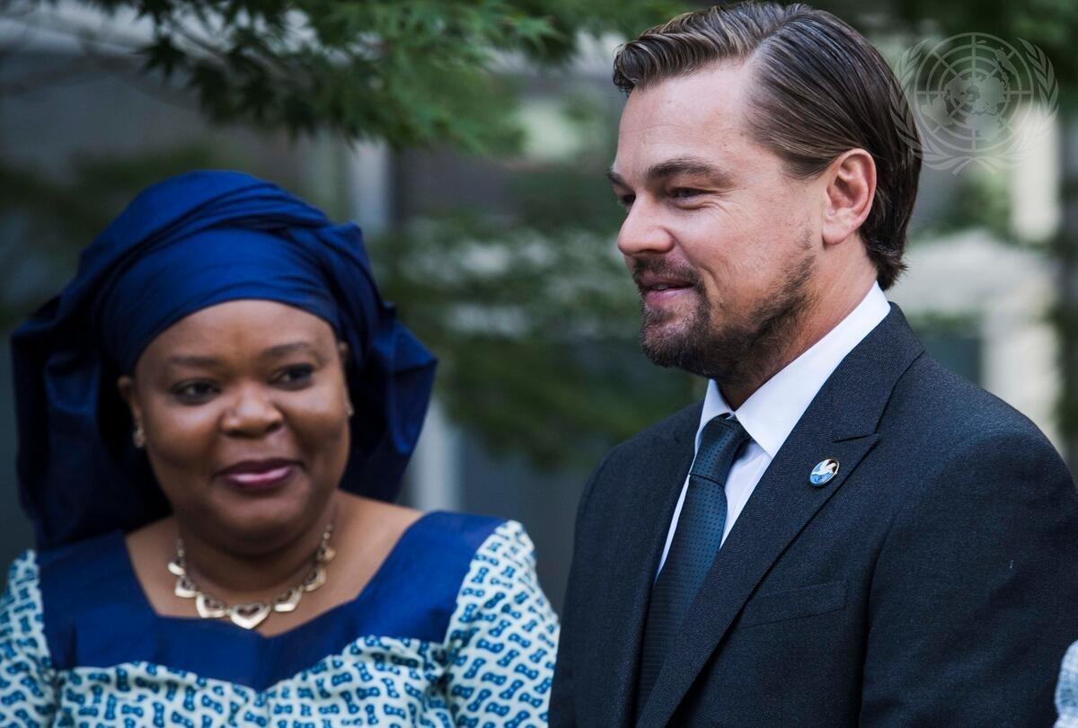 Nobel Peace Laureates Leymah Gbowee (left) with UN Messenger of Peace Leonardo DiCaprio at the annual Peace Bell Ceremony held at UN headquarters in observance of the International Day of Peace (21 September).