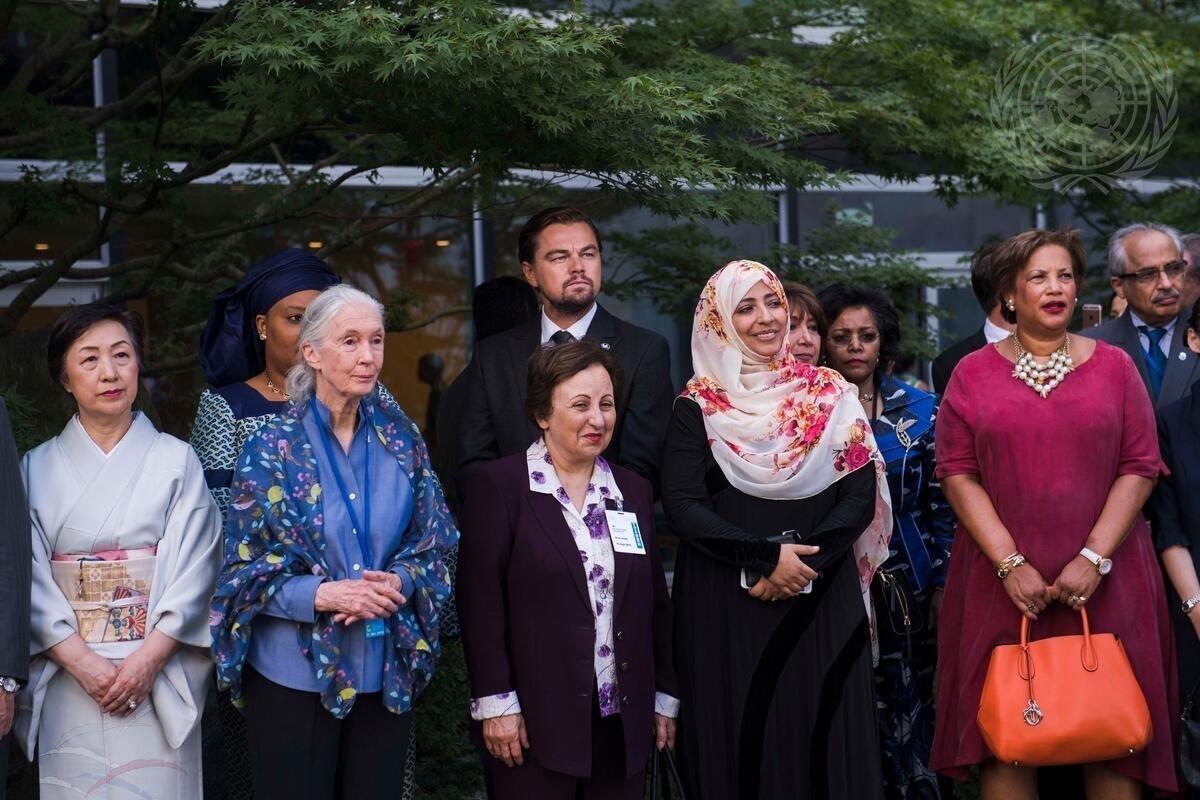 Second row from left: Nobel Peace Laureate Leymah Gbowee; UN Messengers of Peace Leonardo DiCaprio.