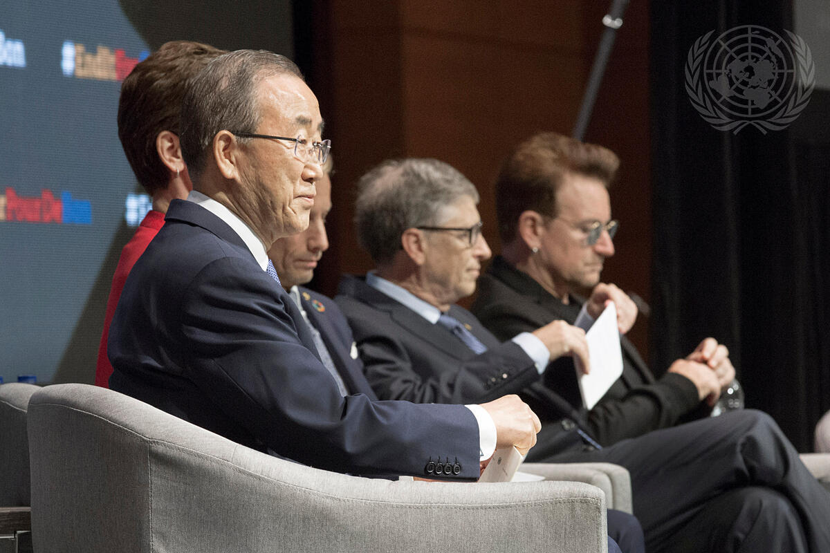 Secretary-General Ban Ki-moon (left) attends the opening of the Fifth Replenishment Conference of the Global Fund to Fight Aids, Tuberculosis and Malaria, in Montreal, Canada. In the background, are keynote speakers, from left to right, Marie-Claude Bibeau, Minister of International Development and La Francophonie, Mark Dybul, Executive Director of the Global Fund to Fight AIDS, Tuberculosis and Malaria, Bill Gates, Co-chair of the Bill & Melinda Gates Foundation, and Bono, U2 frontman and co-founder of (RED).