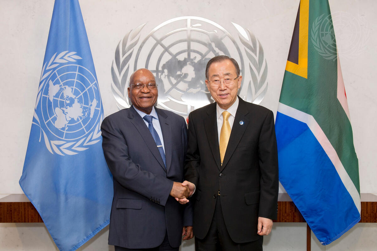 Secretary-General Ban Ki-moon (right) meets with Jacob Zuma, President of the Republic of South Africa.
