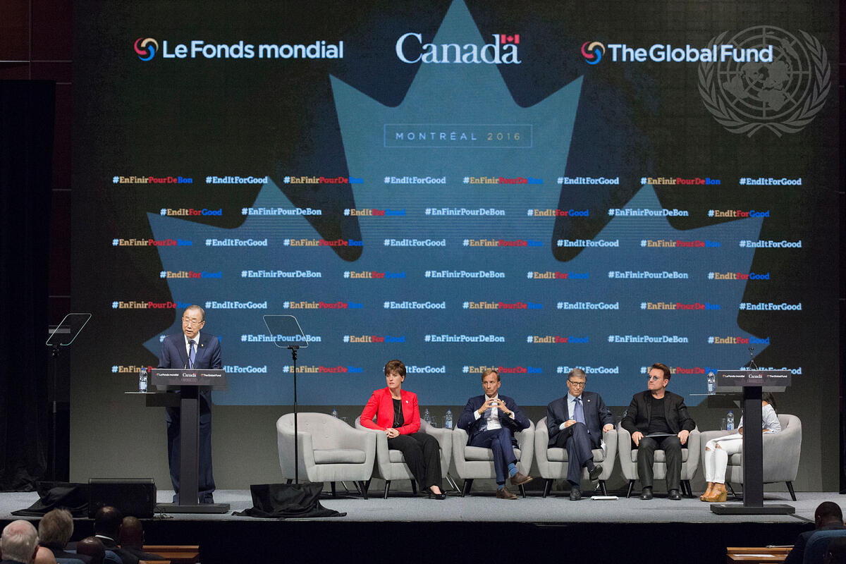 Secretary-General Ban Ki-moon (left) addresses the opening of the Fifth Replenishment Conference of the Global Fund to Fight Aids, Tuberculosis and Malaria, in Montreal, Canada. Seated are keynote speakers, from left to right, Marie-Claude Bibeau, Minister of International Development and La Francophonie; Mark Dybul, Executive Director of the Global Fund to Fight AIDS, Tuberculosis and Malaria; Bill Gates, Co-chair of the Bill & Melinda Gates Foundation; Bono, U2 frontman and co-founder of (RED); and Hannah Godefa, UNICEF Ethiopia National Ambassador.
