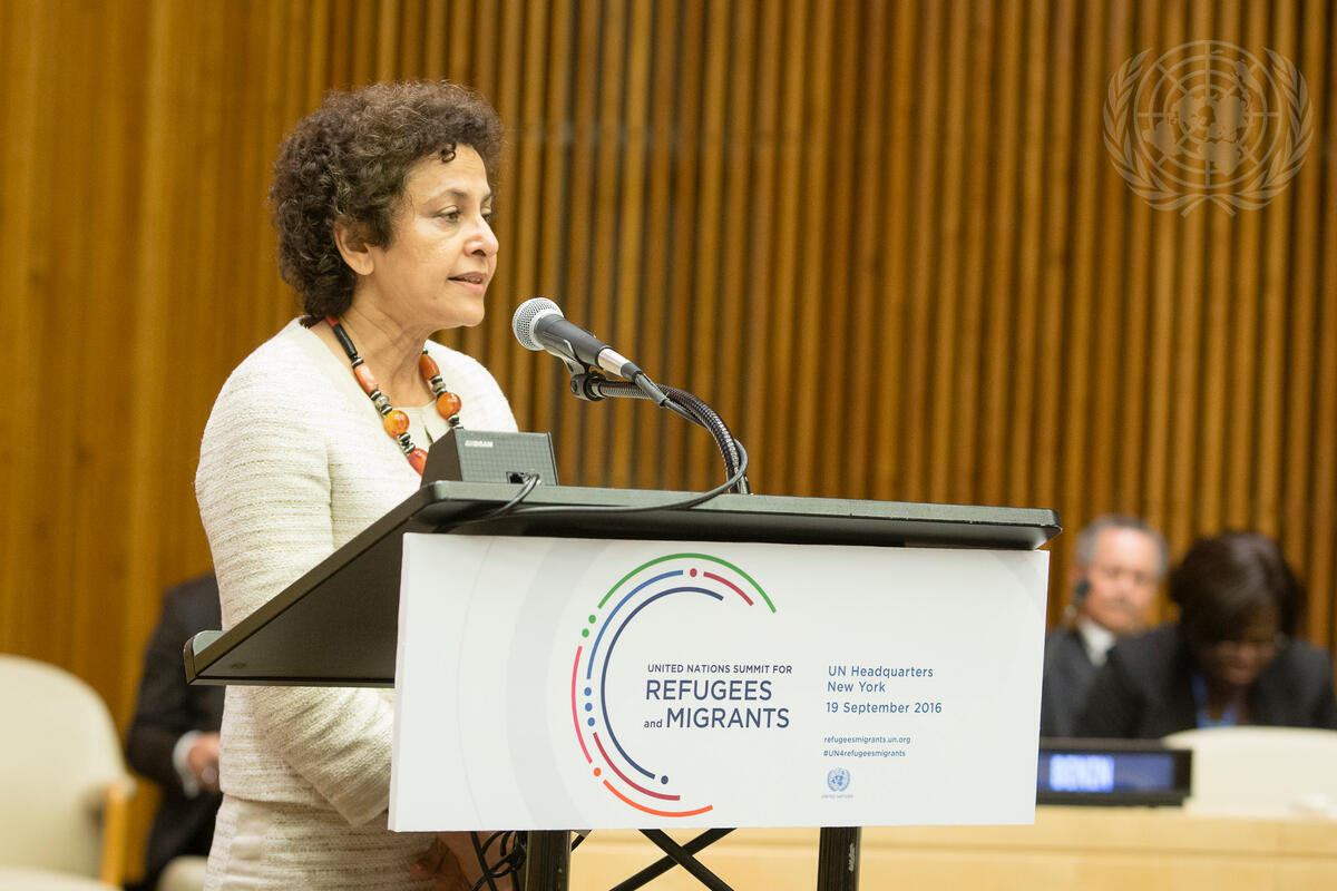 Caption Description Irene Khan, Director-General of the International Development Law Organization (IDLO), addresses the United Nations high-level summit on large movements of refugees and migrants.