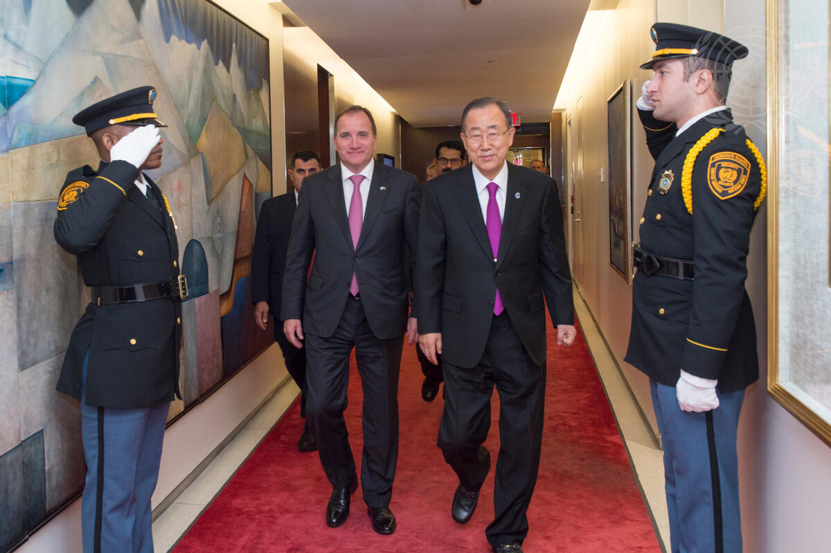Secretary-General Ban Ki-moon (centre right) meets with Stefan Löfven, Prime Minister of Sweden.