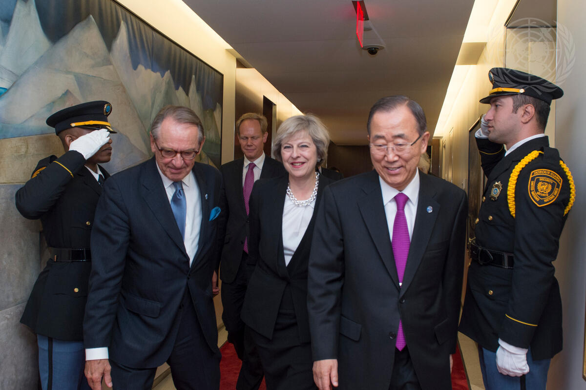 Secretary-General Ban Ki-moon (centre right) meets with Theresa May (centre), Prime Minister of the United Kingdom of Great Britain and Northern Ireland. Pictured with them, Deputy Secretary-General Jan Eliasson (centre left).