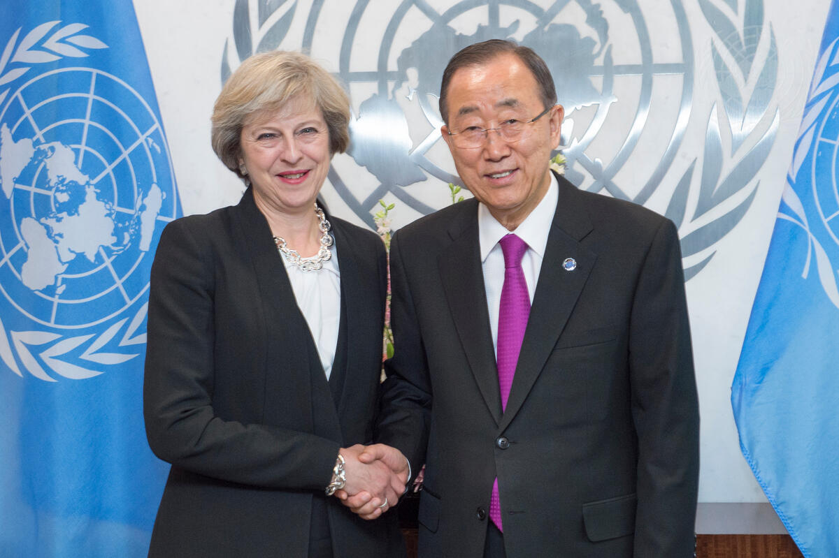 Caption Description Secretary-General Ban Ki-moon (right) meets with Theresa May, Prime Minister of the United Kingdom of Great Britain and Northern Ireland.