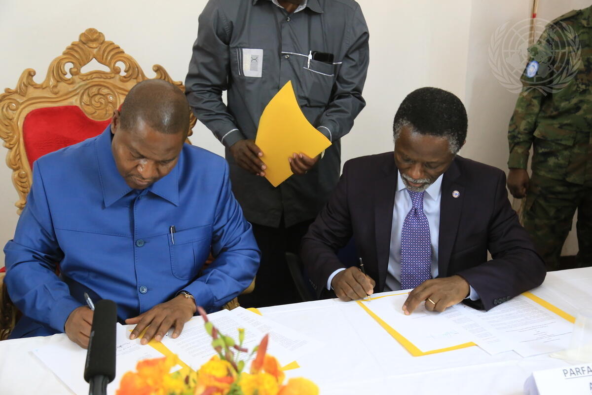 Faustin Archange Touadéra (left), President of the Central African Republic (CAR), and Parfait Onanga-Anyanga (right), Special Representative of the Secretary-General and Head of the UN Multidimensional Integrated Stabilization Mission in the Central African Republic (MINUSCA), visit the town of Kaga-Bandoro, where the President met with representatives of civil society and of armed groups, as well as UN partners. The President also visited sites of MINUSCA quick impact projects (QIPs) and disarmament, demobilisation and reintegration (DDR) projects.