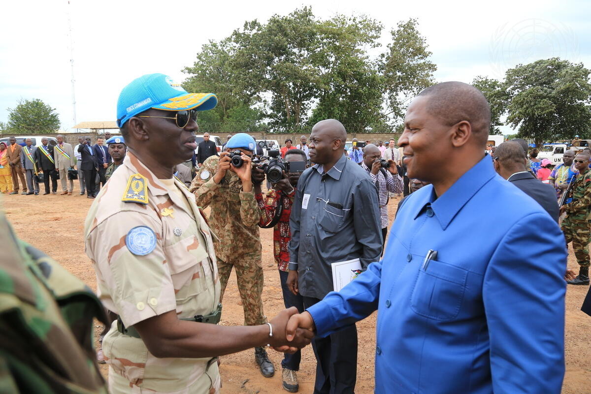 Faustin Archange Touadéra (right), President of the Central African Republic (CAR), accompanied by Parfait Onanga-Anyanga (not pictured), Acting Special Representative of the Secretary-General and Head of the UN Multidimensional Integrated Stabilization Mission in the Central African Republic (MINUSCA), visits the town of Kaga-Bandoro, where he met with representatives of civil society and of armed groups, as well as UN partners. The President also visited sites of MINUSCA quick impact projects (QIPs) and disarmament, demobilisation and reintegration (DDR) projects.
