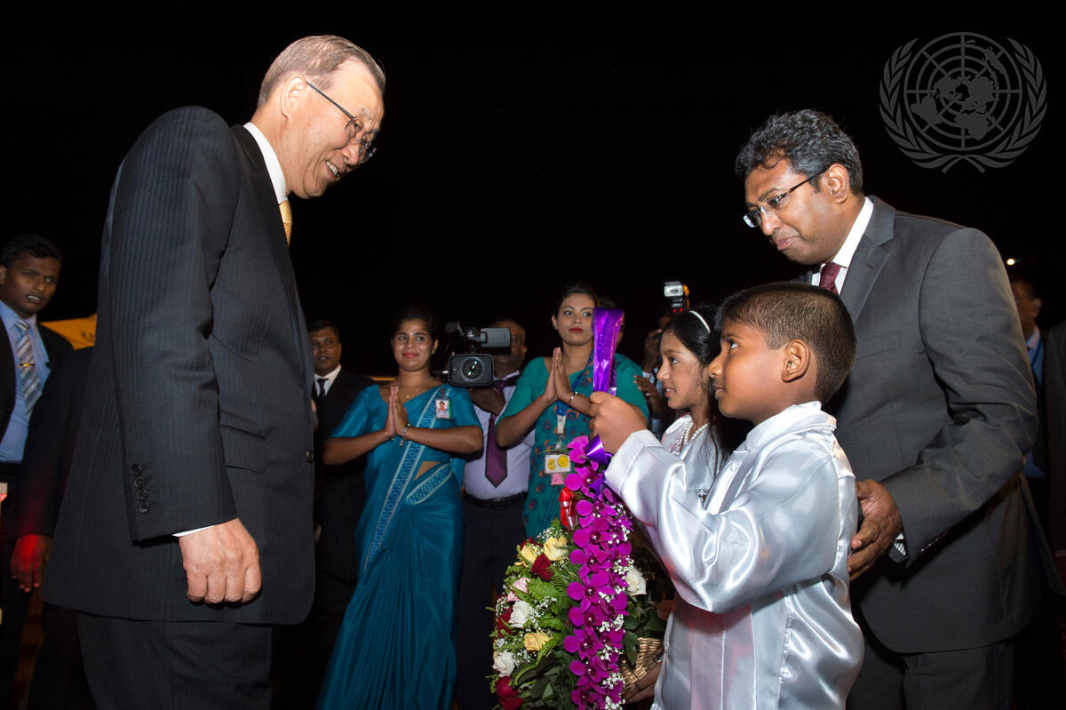 Secretary-General Ban Ki-moon receives a garland from two children, as he is welcomed by Harsha de Silva (right), Deputy Minister for Foreign Affairs of Sri Lanka, on his arrival in Colombo.