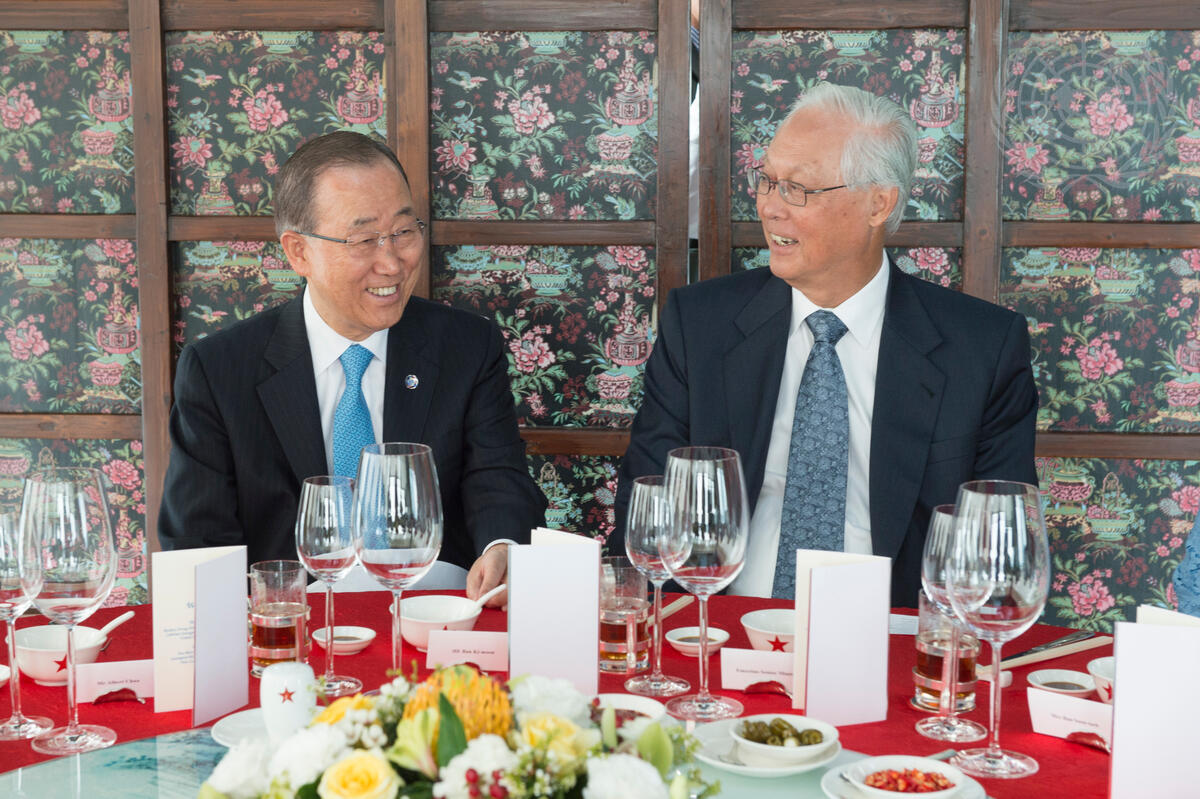 Secretary-General Ban Ki-moon (left) with Goh Chok Tong, Emeritus Senior Minister, Member of Parliament and former Prime Minister of Singapore, during a lunch hosted by Mr. Goh.
