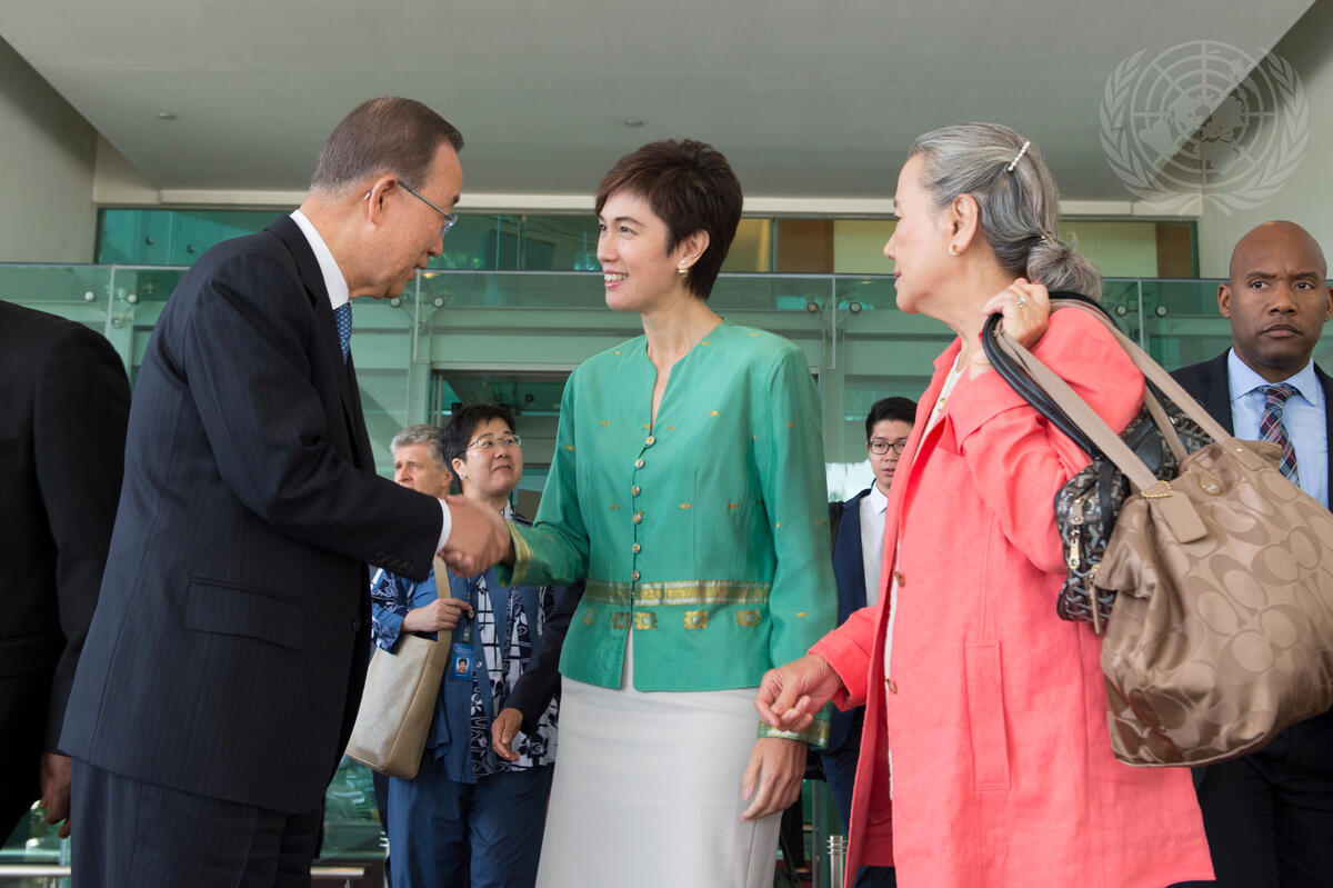 Secretary-General Ban Ki-moon (left) and his wife, Yoo Soon-taek (right), are received by Josephine Teo, Senior Minister of State of the Republic of Singapore, on their arrival in the country.