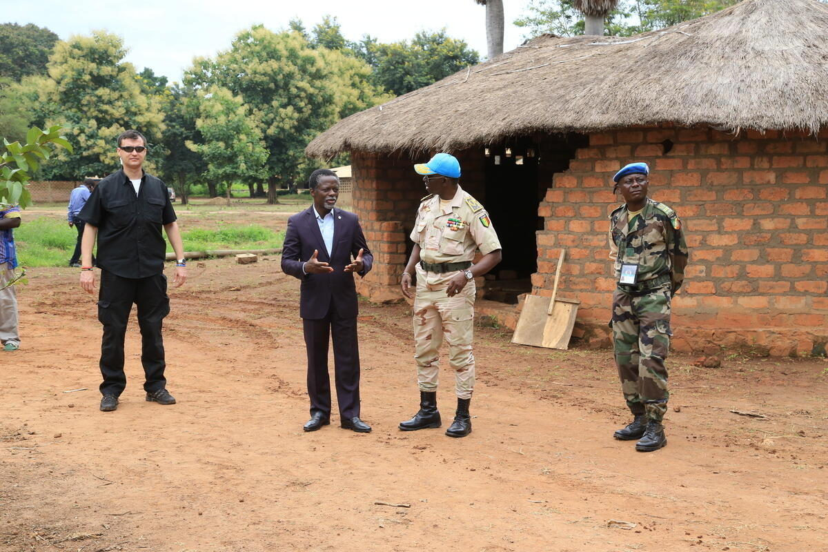 Mr. Onanga-Anyanga (centre left) speaking with a MINUSCA peacekeeper during the visit to Kaga-Bandoro.