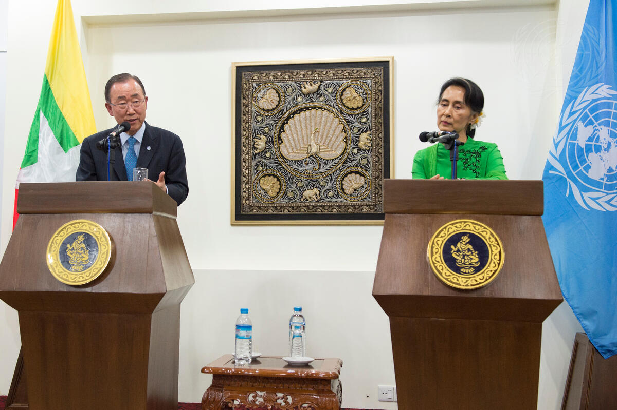 Secretary-General Ban Ki-moon (left) during his joint press conference with Aung San Suu Kyi, State Counsellor and Minister for Foreign Affairs of the Republic of the Union of Myanmar, following their meeting.