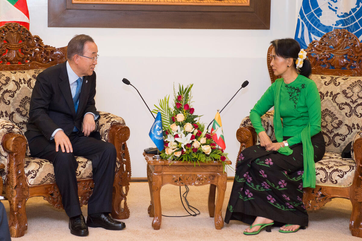 Secretary-General Ban Ki-moon (left) meets with Aung San Suu Kyi, State Counsellor and Minister for Foreign Affairs of the Republic of the Union of Myanmar.
