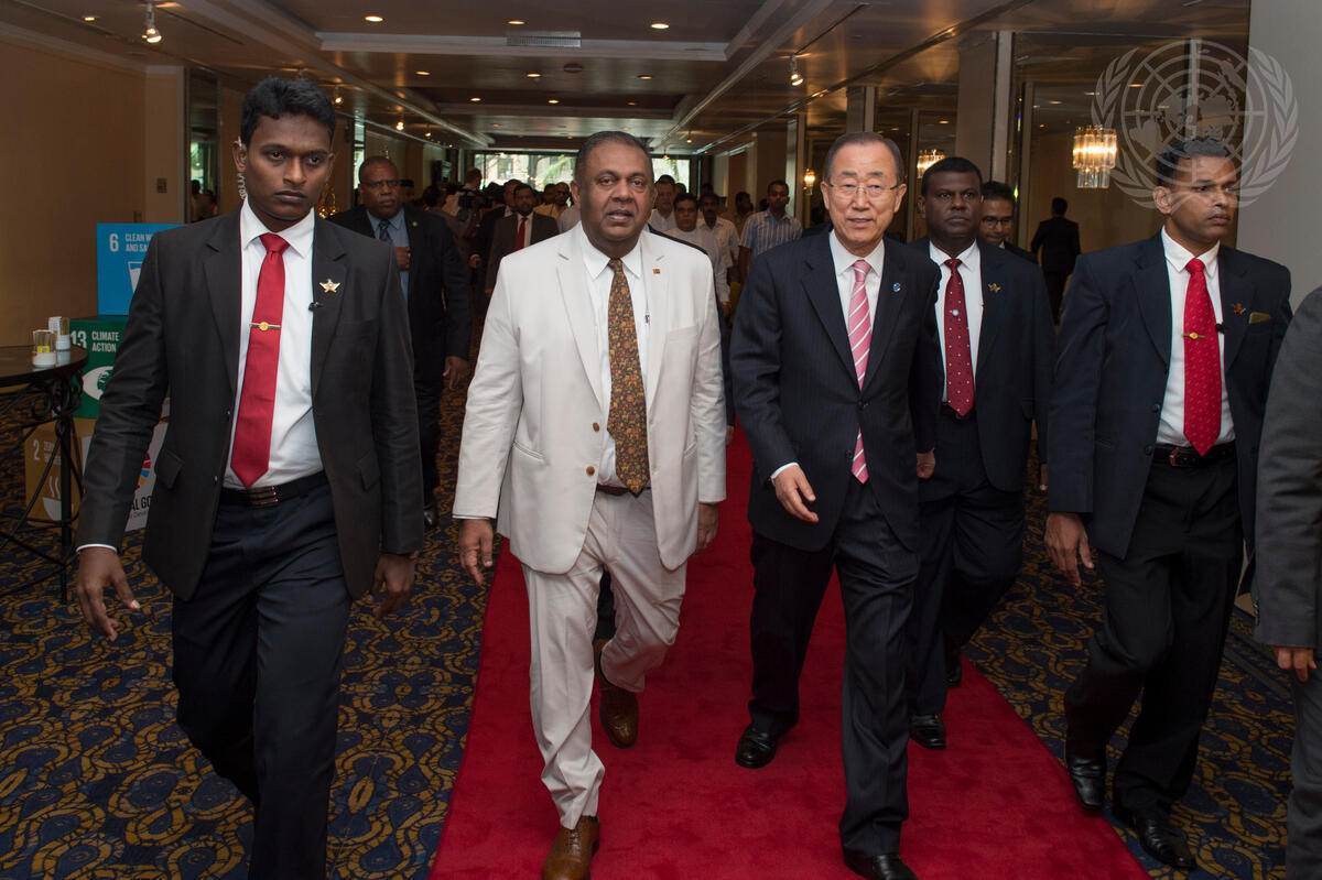 Secretary-General Ban Ki-moon (centre right) on his way to deliver speech on ""Sustaining Peace - Achieving Sustainable Development Goals"" in Colombo, Sri Lanka. Mangala Samaraweera (centre left), Minister for Foreign Affairs of Sri Lanka, accompanies him.