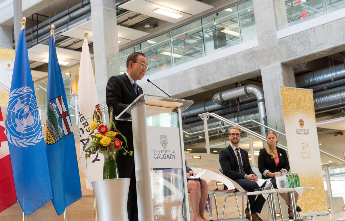 Secretary-General Ban Ki-moon (left) addresses faculty and students at the University of Calgary.