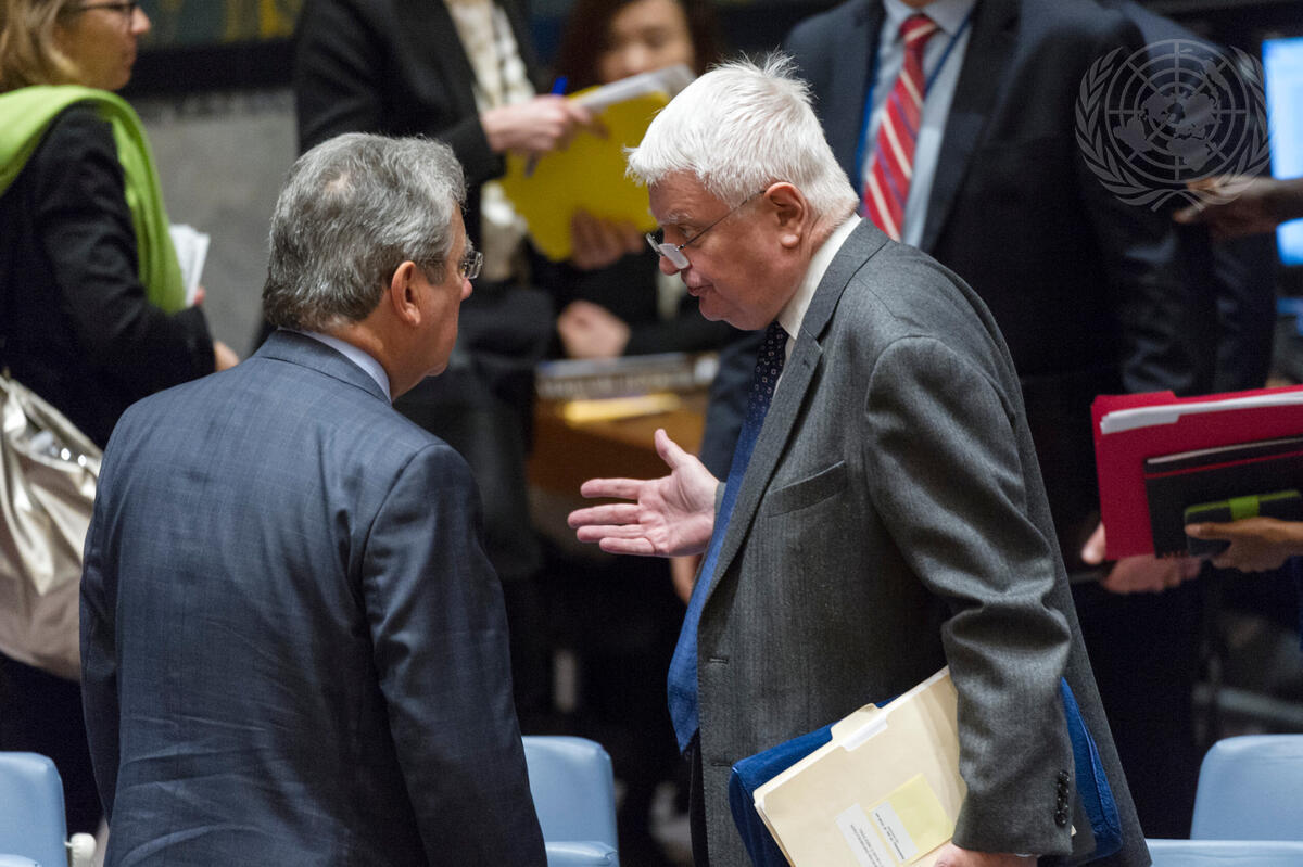 Hervé Ladsous (right), Under-Secretary-General for Peacekeeping Operations, with Elbio Oscar Rosselli Frieri, Permanent Representative of Uruguay to the UN, at the Security Council meeting on the situation in Mali.