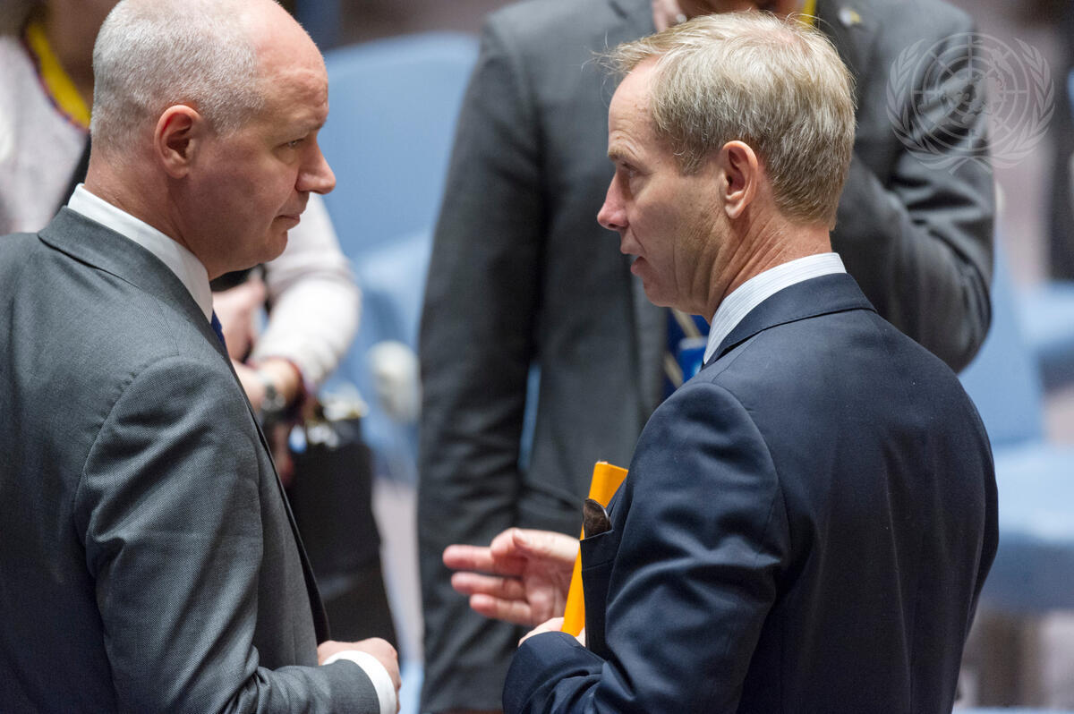 Olof Skoog (right), Permanent Representative of Sweden to the UN and President of the Security Council for January, with Peter Wilson, Deputy Permanent Representative of the United Kingdom, at the to the Security Council meeting on developments and trends in West Africa and the Sahel.