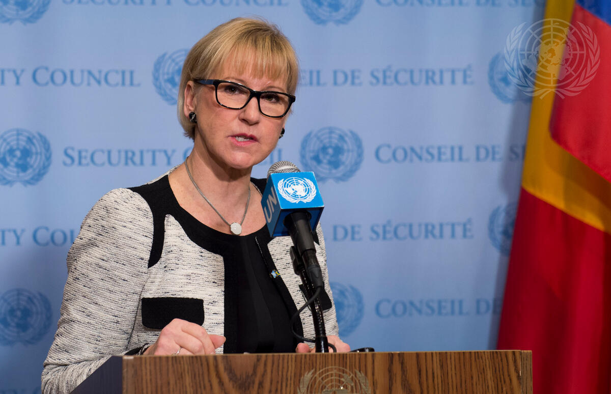 Margot Wallström, Minister for Foreign Affairs of Sweden and President of the Security Council for January, speaks to journalists on the Council's ministerial-level open debate on conflict prevention and sustaining peace.