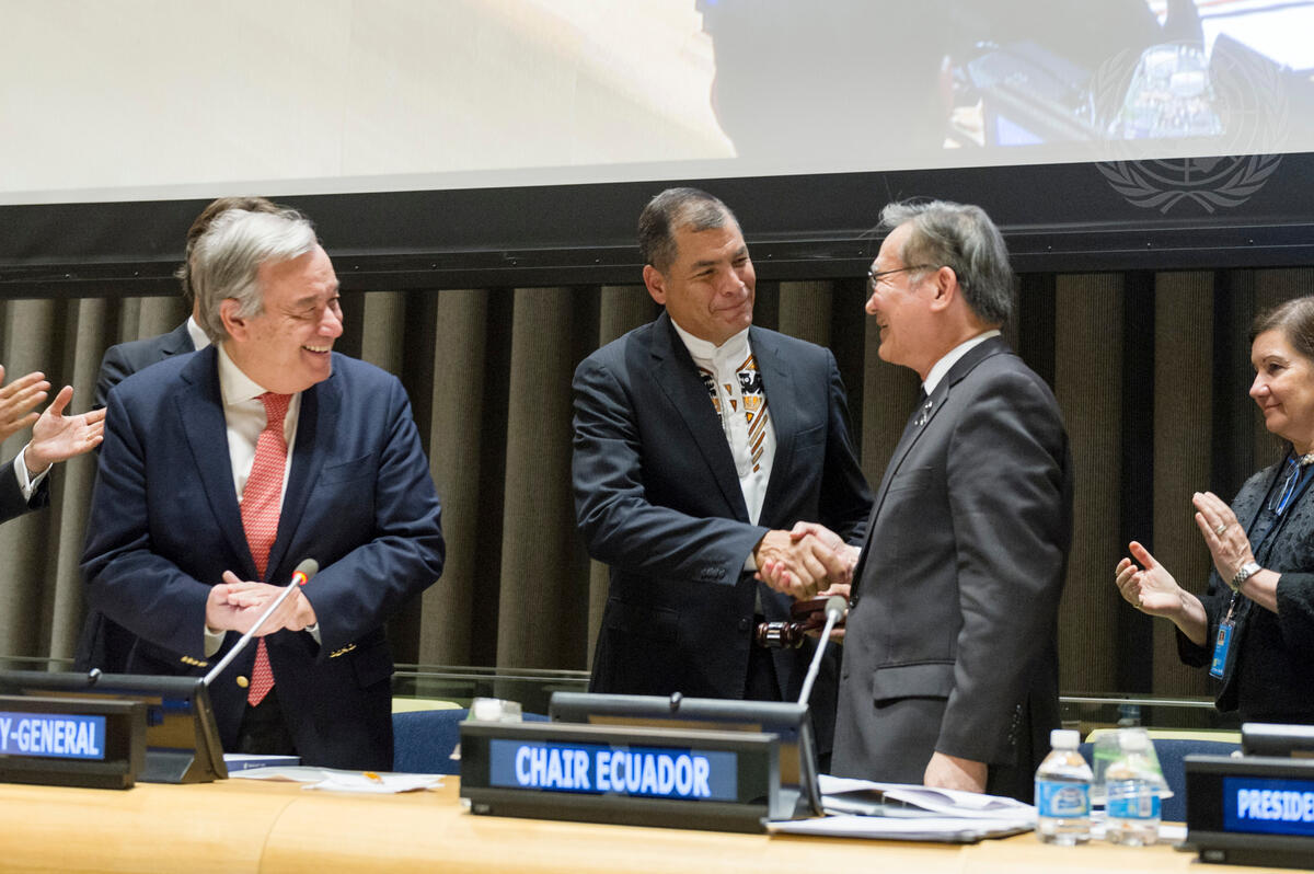 Rafael Correa (centre left), President of Ecuador, with Don Pramudwinai (centre right), Minister for Foreign Affairs of Thailand, during the ceremony. Also pictured: Secretary-General António Guterres (left); Maria Luiza Ribeiro Viotti (right), Chef De Cabinet to the Secretary-General.