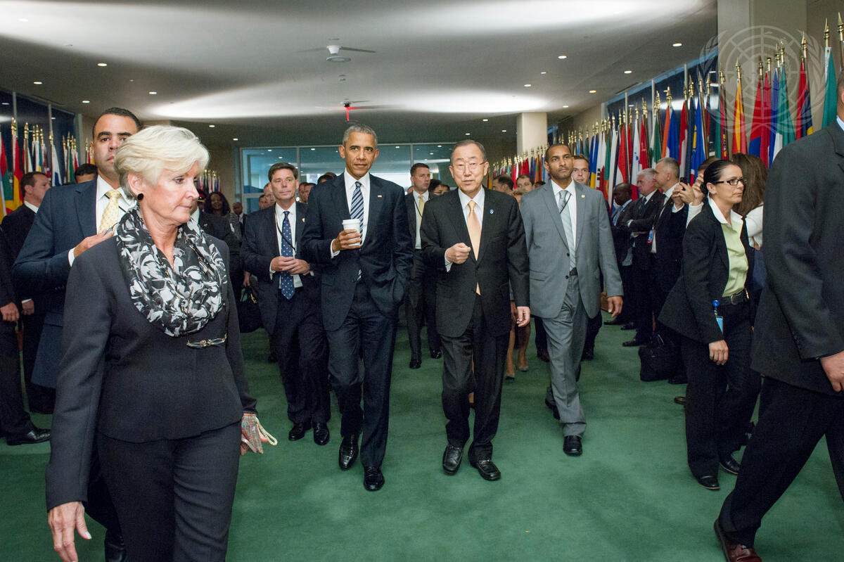 The Secretary-General (centre right) arrives for the luncheon with United States President Barack Obama (centre left).