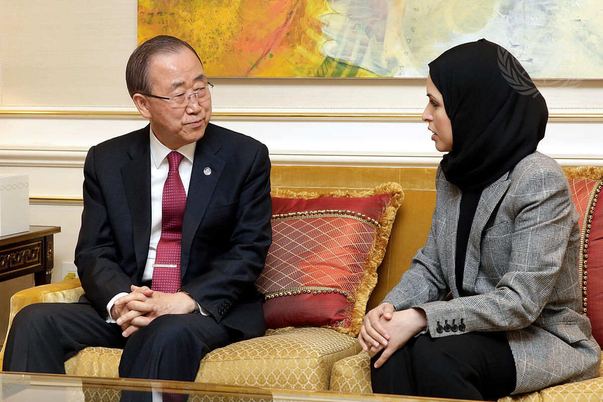 Secretary-General Ban Ki-moon (left) offers his condolences to Alya Ahmed Saif Al-Thani (right), Permanent Representative of the State of Qatar to the United Nations, on the death of Khalifa bin Hamad bin Abdullah bin Jassim bin Mohammed Al Thani, who was the Emir of Qatar from 1972 to 1995. He died on October 23rd at the age of 84.
