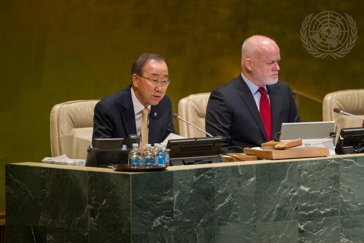 Secretary-General Ban Ki-moon (left) speaks at the seventy-first session of the General Assembly to pay tribute to the memory of Bhumibol Adulyadej, the late King of Thailand, who died on October 13, 2016. On the right is Peter Thomson, President of the seventy-first sesion of the General Assembly.