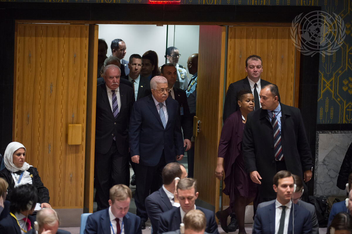 Mahmoud Abbas (centre), President of the State of Palestine, enters the Security Council chamber prior to a meeting on the situation in the Middle East, including the Palestinian question.
