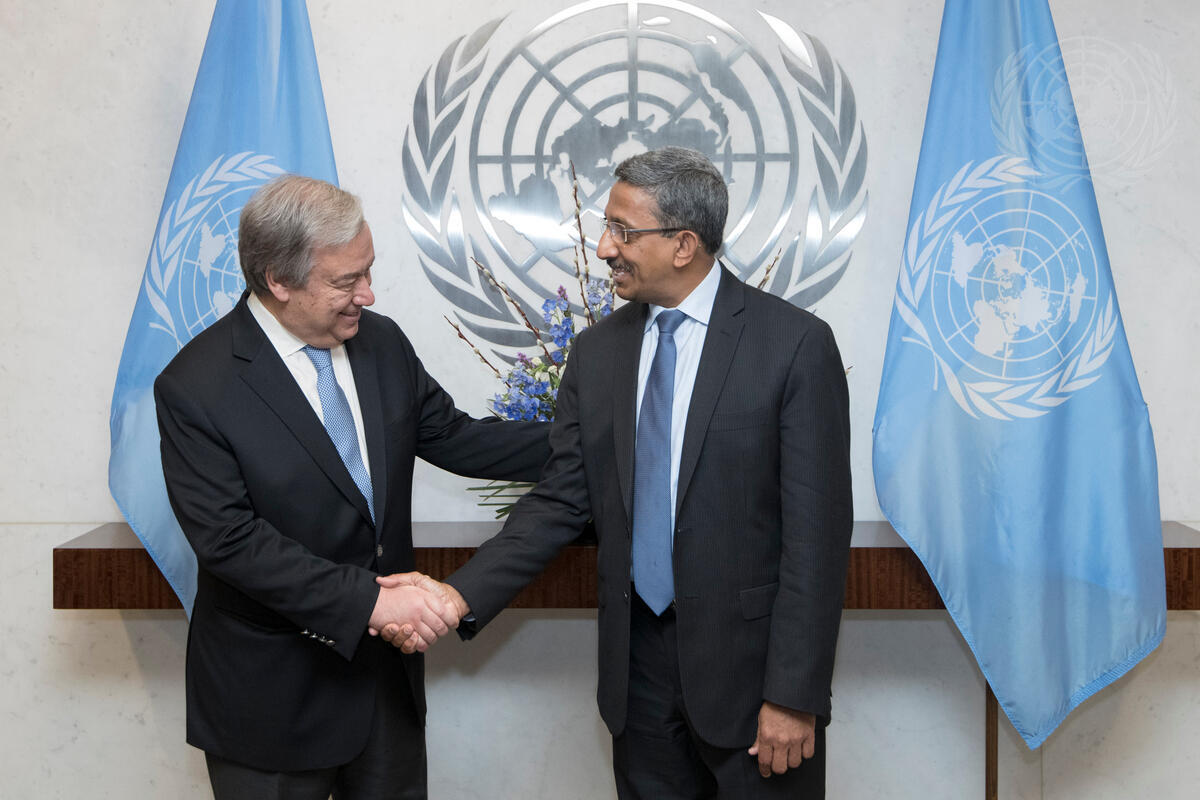 Secretary-General António Guterres (left) swears in Chandramouli Ramanathan, new Assistant Secretary-General for Enterprise Resource Planning of the Department of Management.